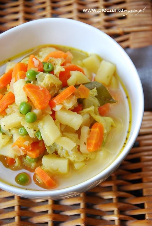 głównymi składnikami to: ziemniaki, marchew, kapusta pekińska i groszek ; ) Mięso można pominąć w wersji wege. Taki talerz zupy to świetny pomysł na zgrabną sylwetkę, a wakacje i plaża tuż, tuż ; )
